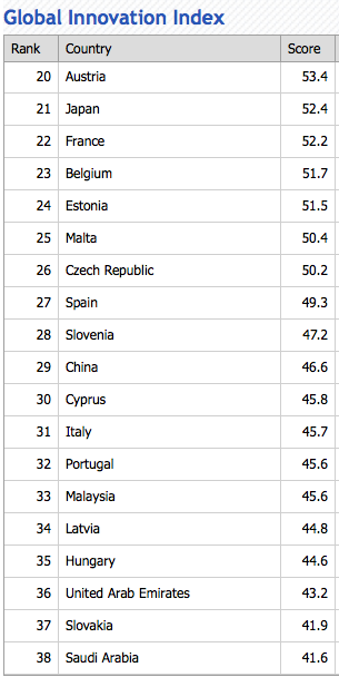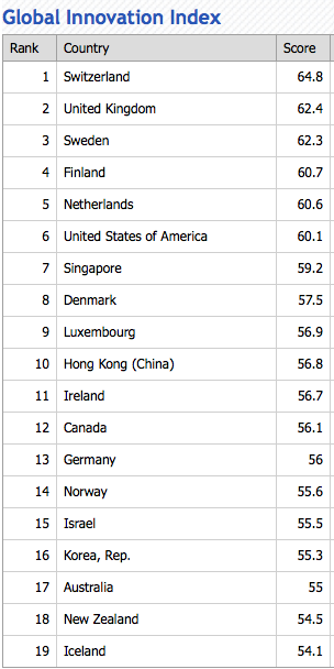 El Global Innovation Index es un ranking de 143 países según su capacidad de innovación elaborado por la Cornell University, la escuela de negocios INSEAD y la World Intellectual Property Organization (WIPO, una agencia de Naciones Unidas). Los datos son de 2014.