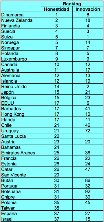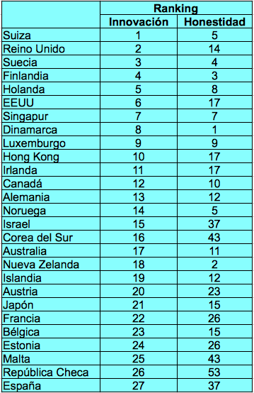 El primer cuadro recoge los 27 países mejor clasificados en el ranking por innovación y relaciona esta con la honestidad percibida por los ciudadanos en el sector público. Se puede ver que, en general, las naciones más innovadoras tienen también un nivel de corrupción menor.