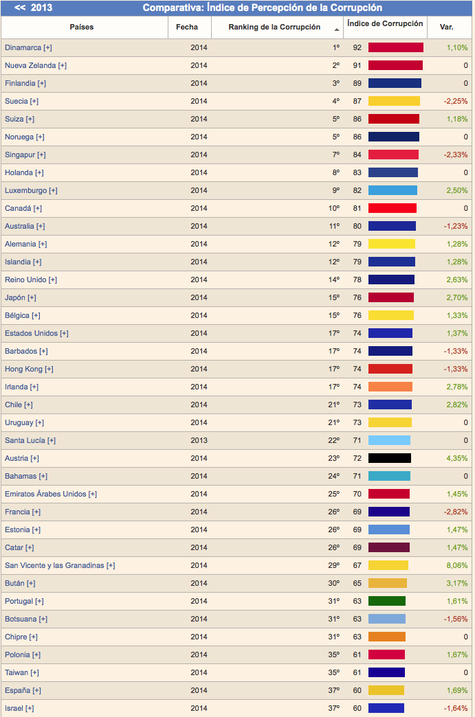 El Indice de Percepción de la Corrupción es elaborado por la Organización de Transparencia Internacional y clasifica 177 países del mundo según el grado percibido por los ciudadanos sobre la corrupción en el sector público de su país. Los países se clasifican de menos a más corruptos. Los datos son de 2014.