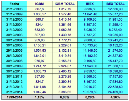En la tabla podemos ver cómo ha evolucionado cada uno de ellos entre el 31 de diciembre de 1998 y el 31 de diciembre de 2014 (un período de 16 años). Vemos que a finales de 2014 el IGBM estaba prácticamente igual que en 1999 pero que el IGBM Total se ha duplicado en este período.