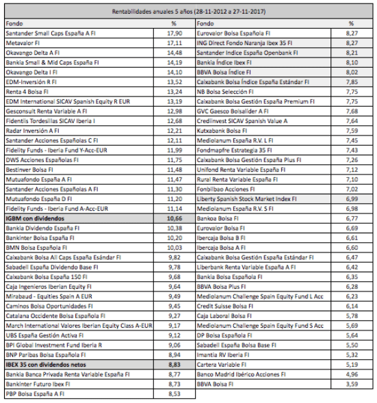 El segundo cuadro recoge la rentabilidad anual de los 67 fondos de gestión activa y de los 6 fondos indexados con un histórico de al menos 5 años, en el período del 28 de noviembre de 2012 al 27 de noviembre de 2017. De los 67 fondos de gestión activa, 19 batieron al IGBM con dividendos, el 28% del total. De estos, diez lo hicieron en más de un 2% anual.