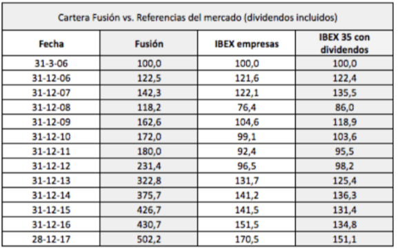Si establecemos un índice con base 100 al 31 de marzo de 2016, el valor de la cartera Fusión se multiplicó por 5,02 hasta el 28 de diciembre de 2017 mientras que el IBEX Empresas lo hizo por 1,7 y el IBEX 35 por 1,51. En todos los casos se ha considerado la reinversión de dividendos brutos a efectos comparativos.