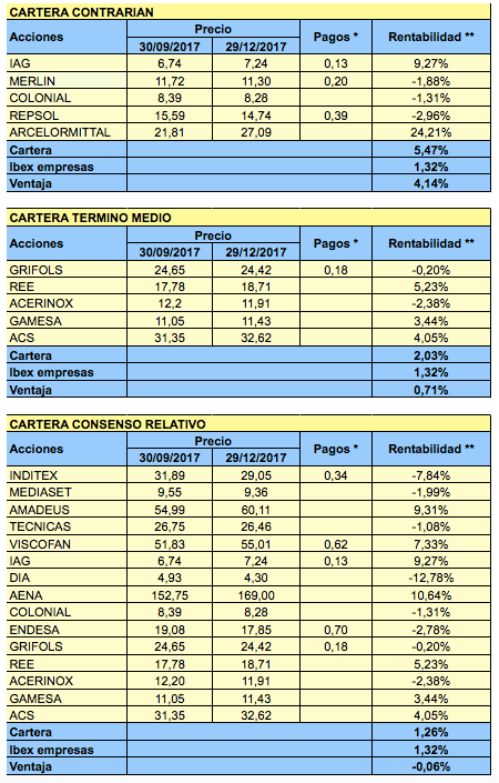 Entre las carteras basadas en las recomendaciones de los analistas, la Analistas Pesimistas ha vuelto a hacerlo mucho peor que el mercado, como es habitual, aunque se da la circunstancia de que ha ido a contracorriente en el último trimestre del año. La Analistas Optimistas superó ampliamente la referencia (la rentabilidad media simple de los 35 valores del IBEX 35). Desde enero de 2014, fecha de inicio de esas carteras, la que más se ha revalorizado ha sido la Analistas Indiferentes, con un 34,05%, seguida de la Analistas Optimistas con un 28,47%, mientras que la Analistas Pesimistas ha perdido un 16,47%. En el mismo período, la referencia ha ganado un 20,28% (y el IBEX 35 con dividendos, un 19,56%), de modo que las dos primeras lo han hecho mejor que el mercado.