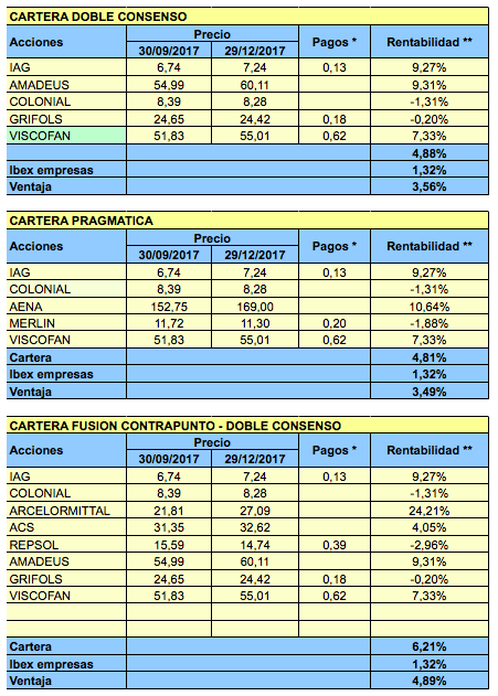 Entre las carteras basadas en las recomendaciones de los analistas, la Analistas Pesimistas ha vuelto a hacerlo mucho peor que el mercado, como es habitual, aunque se da la circunstancia de que ha ido a contracorriente en el último trimestre del año. La Analistas Optimistas superó ampliamente la referencia (la rentabilidad media simple de los 35 valores del IBEX 35). Desde enero de 2014, fecha de inicio de esas carteras, la que más se ha revalorizado ha sido la Analistas Indiferentes, con un 34,05%, seguida de la Analistas Optimistas con un 28,47%, mientras que la Analistas Pesimistas ha perdido un 16,47%. En el mismo período, la referencia ha ganado un 20,28% (y el IBEX 35 con dividendos, un 19,56%), de modo que las dos primeras lo han hecho mejor que el mercado.