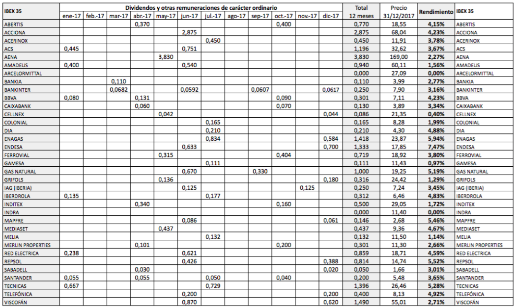 La tabla siguiente indica los dividendos ordinarios pagados por las compañías del IBEX 35 en los últimos doce meses.