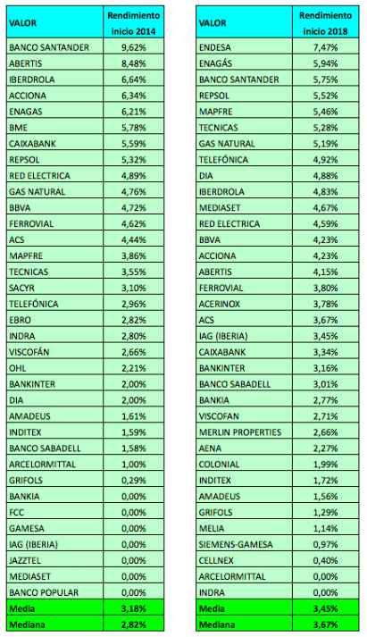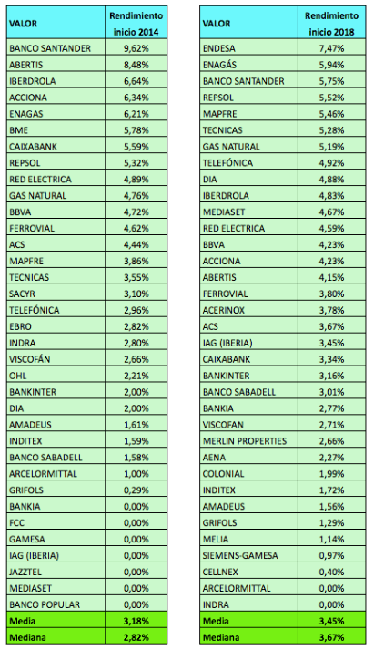 Si nos centramos en el IBEX 35, vemos que el rendimiento por dividendo se ha incrementado en este período. Tomando como referencia los precios de cierre de 2013 y de 2017, el rendimiento por dividendo ordinario de los valores del selectivo era de una media del 3,18% al empezar 2014 y de un 3,45% al inicio de 2018. Pero en 2014 los rendimientos eran más extremos, como puede observarse en las tablas, mientras que en 2018 hay menor dispersión. Si en 2014 había siete valores que no habían retribuido a sus accionistas el año anterior, en 2018 solo encontramos dos (ArcelorMittal e Indra). Un dato más representativo, por tanto, es el rendimiento mediano (el rendimiento del valor que ocupa la posición central en los siguientes rankings), que era del 2,82% en enero de 2014 y del 3,67% en enero de 2018.