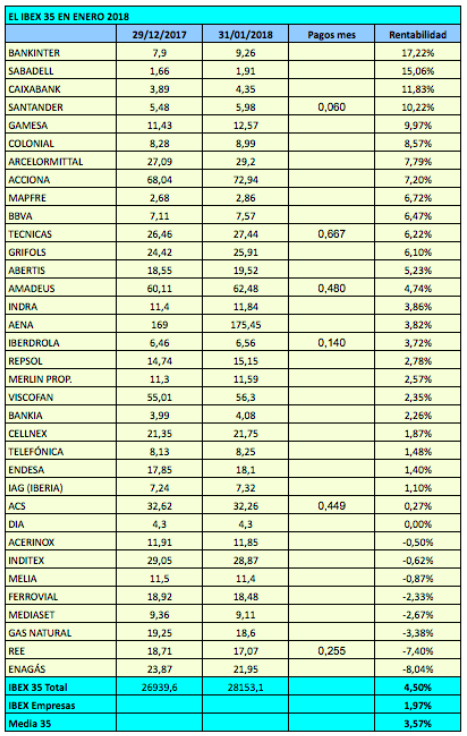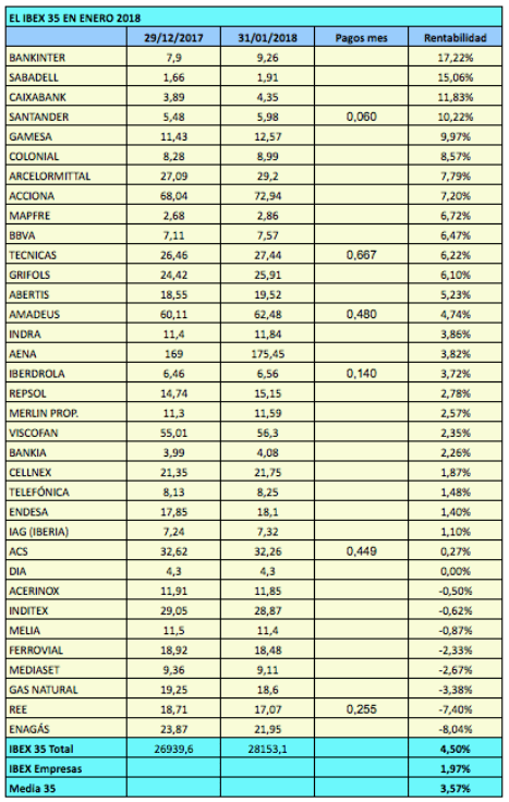 El IBEX 35 con dividendos se revalorizó un 4,5% en enero por el buen comportamiento de las entidades financieras pero las empresas no financieras ganaron una media del 1,97%.