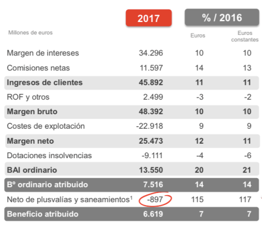 En la cuenta de resultados resumida presentada por la entidad, vemos que el beneficio neto ordinario atribuido fue de 7.516 millones de euros, un 14% más que en 2016. Pero la entidad calculó unos resultados negativos no recurrentes de 1.257 millones de euros, incluyendo una depreciación del fondo de comercio por valor de 603 millones de euros y unos costes de integración por la compra de Banco Popular de 300 millones de euros, que se vieron compensados por plusvalías extraordinarias y la reforma fiscal en Estados Unidos, lo que arrojó un saldo negativo de partidas consideradas no recurrentes de un total de 897 millones de euros. Tras ese cargo, el beneficio neto atribuido ascendió a 6.619 millones de euros, un incremento del 7% respecto a 2016.