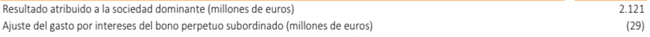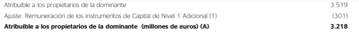 BBVA declara un beneficio neto “atribuible a los propietarios de la dominante“ de 3.519 millones de euros (los propietarios de la dominante son los accionistas de BBVA). De aquí deduce 301 millones de euros para remunerar “instrumentos de capital de nivel 1 adicional“, que hace referencia principalmente a obligaciones perpetuas convertibles en acciones. Tras ello llegamos al dato de 3.218 millones de beneficio neto realmente atribuible a los accionistas. ¿Y cómo define este concepto el BBVA? De nuevo como beneficio neto “atribuible a los propietarios de la dominante“ pero en negrita.