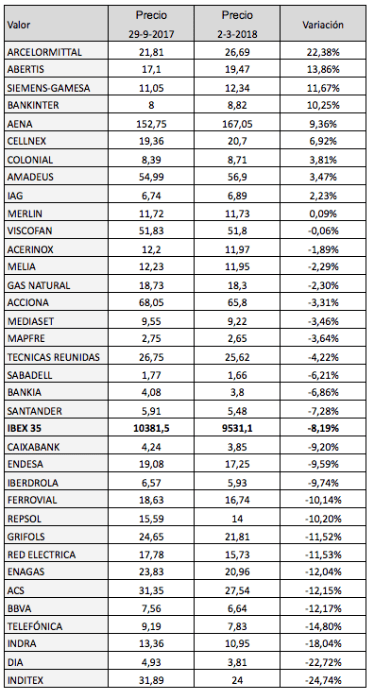 Entre el 29 de septiembre de 2017 y el 2 de marzo de 2018, el IBEX 35 ha caído de 10.381,5 a 9.531,1 puntos, un 8,19%. En la tabla siguiente vemos que han sido sobre todo los grandes valores los que han arrastrado el índice hacia abajo, en particular Inditex, que ha sido el peor valor, con una minusvalía de casi el 25%.