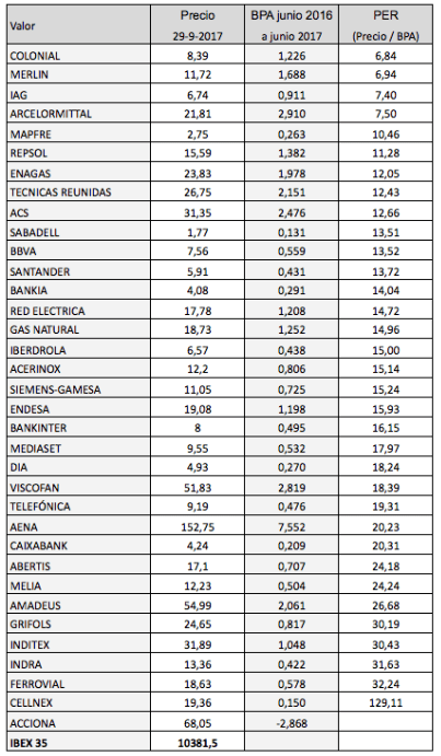 El 29 de septiembre de 2017, una vez conocidos todos los beneficios por acción interanuales a 30 de junio del mismo año, el ranking era el siguiente. Entonces el IBEX 35 estaba a 10.381,5 puntos y el PER mediano fue de 15,24.
