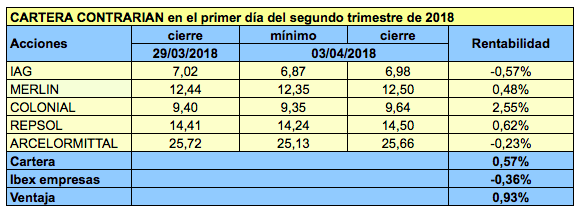 En el primer día hábil del segundo trimestre de 2018, los cinco valores de la cartera Contrarian han podido comprarse por debajo del precio de referencia, la cotización al cierre de marzo.