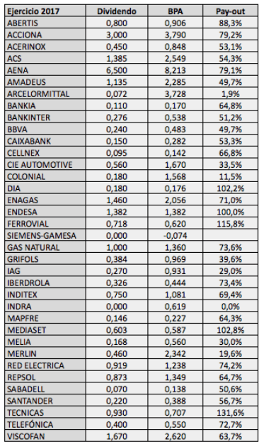 Pay-out de los valores del IBEX 35 en 2017