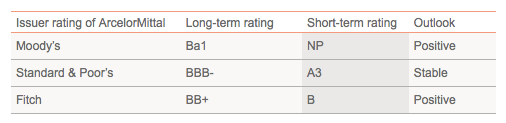 La prudente política de la empresa obedece a una prioridad: conseguir que sus emisiones de deuda dejen de ser consideradas de “grado especulativo“. Los expertos suelen referirse a este tipo de calificación con el peyorativo de “bonos basura“. Pero aclaremos este punto. Las principales agencias de calificación de riesgos, Moody’s, Standard and Poor’s y Fitch, otorgan a la deuda financiera a largo plazo de ArcelorMittal una calificación de Ba1, BBB- y BB+ respectivamente, tal como puede verse en el siguiente cuadro obtenido de la web de la compañía. La Ba1 de Moody’s y la BB+ de Fitch son en ambos casos justo el primer escalón del grado especulativo, o sea que para alcanzar el “grado de inversión“ o deuda de calidad, la empresa solo debe mejorar su calificación un grado. La BBB- de Standard and Poor’s es el último escalón del “grado de inversión“.