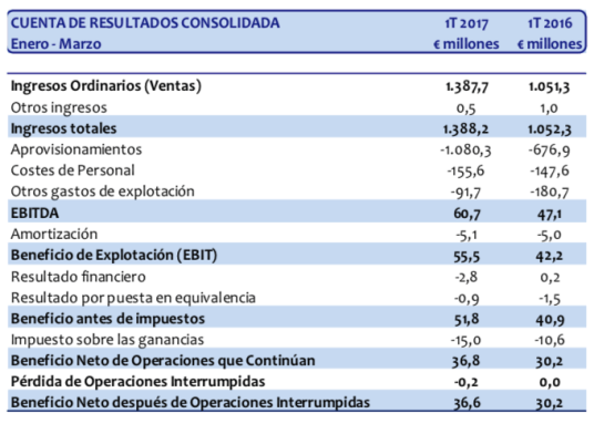 En el informe de resultados del primer trimestre de 2017 Técnicas Reunidas presentó el siguiente balance de resultados: