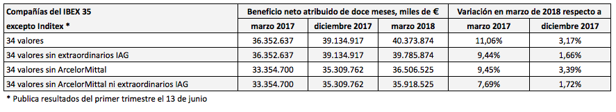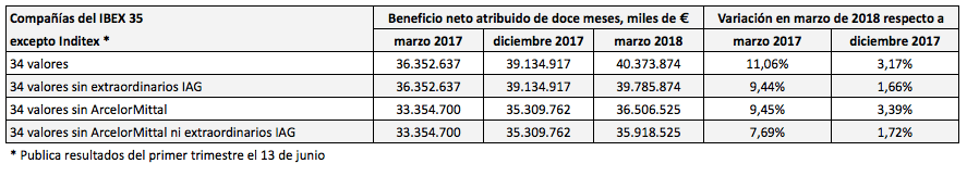 Si queremos ver cómo evolucionan las empresas españolas deberíamos descartar a ArcelorMittal, pues es una sociedad domiciliada en Luxemburgo y que presenta sus estados financieros en dólares. Por otro lado, en el IBEX 35 se le aplica un coeficiente reductor del 80% debido a su bajo capital en circulación. Si no tenemos en cuenta los extraordinarios de IAG ni los resultados de ArcelorMittal, los beneficios netos interanuales de las compañías españolas del IBEX a marzo de 2018 aumentaron un 7,69% respecto a los beneficios interanuales a marzo de 2017, y un 1,72% respecto al ejercicio 2017.