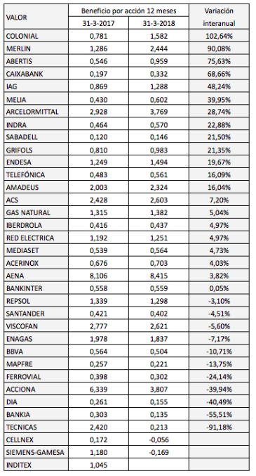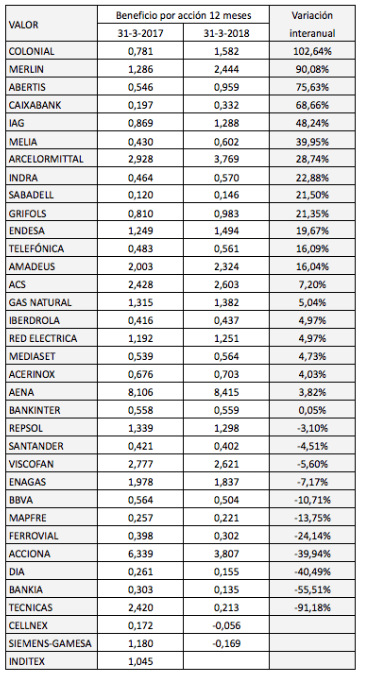 Si tenemos en cuenta el beneficio por acción del IBEX 35, el aumento fue todavía menor. Ver El verdadero incremento de los beneficios del IBEX 35 tras los resultados del primer trimestre de 2018.