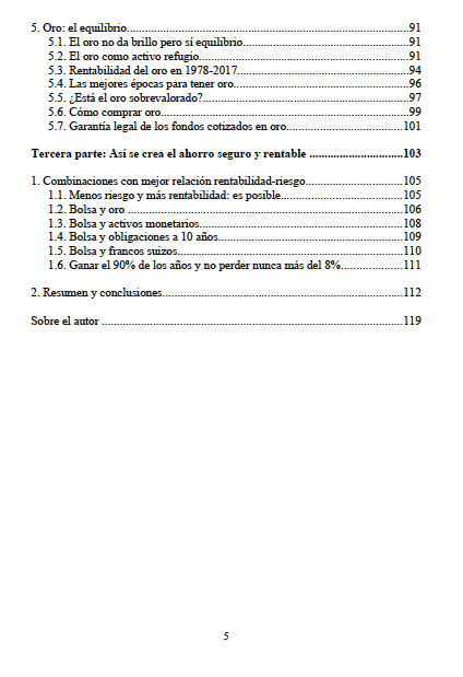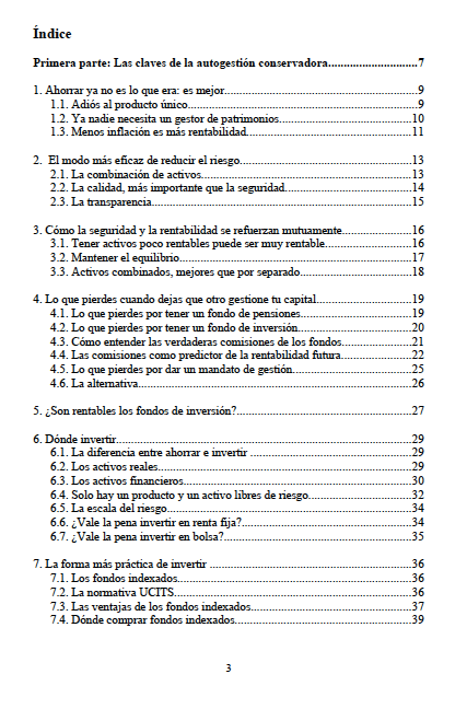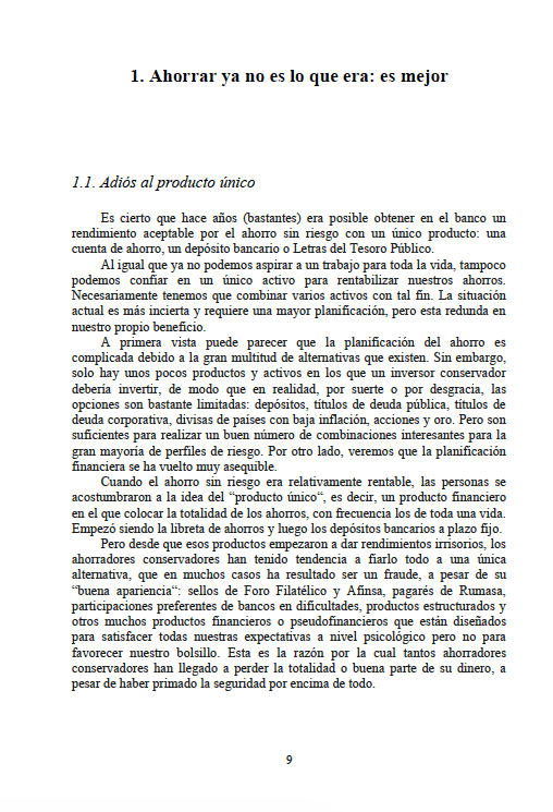 En busca del ahorro seguro y rentable es una guía práctica para el inversor conservador. Contiene información detallada sobre cómo elegir los mejores productos financieros para invertir en renta fija pública, renta fija corporativa, renta variable de España, Estados Unidos y Alemania, y oro. Estos productos permitirán al ahorrador planificar su ahorro a largo plazo con un bajo coste en términos de comisiones, lo que le dará una rentabilidad extra de en torno al 2% anual respecto a lo que le costaría tener su capital en fondos de gestión activa o bajo un mandato de gestión. También le permitirán un ahorro considerable en impuestos gracias a la normativa armonizada europea UCITS.