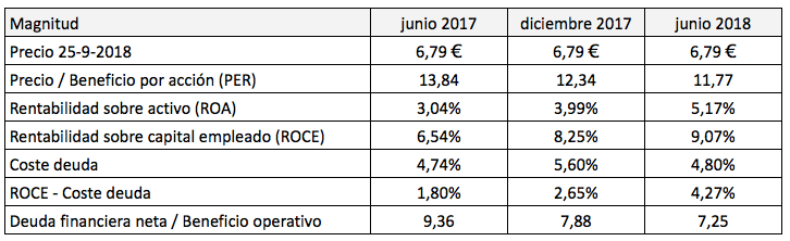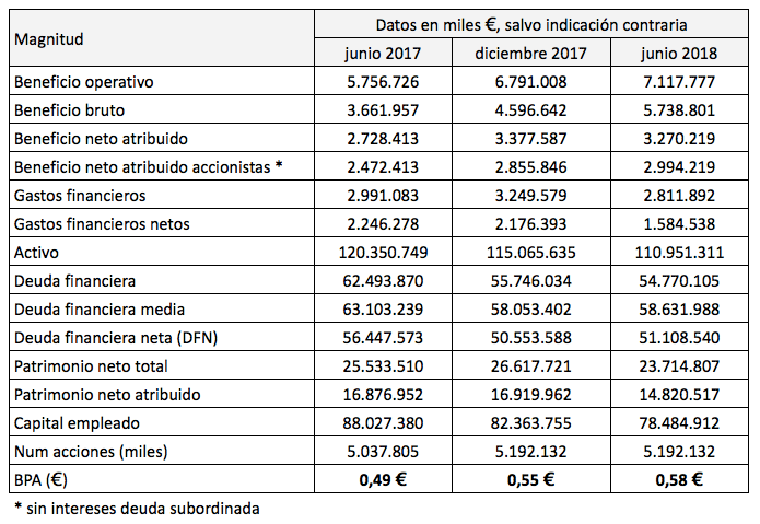 En los últimos doce meses (de junio de 2017 a junio 2018), la situación ha seguido mejorando. El beneficio neto interanual atribuido a los accionistas ha aumentado un 21%, los gastos financieros netos han disminuido un 30% y la deuda financiera neta lo ha hecho en un 10%.