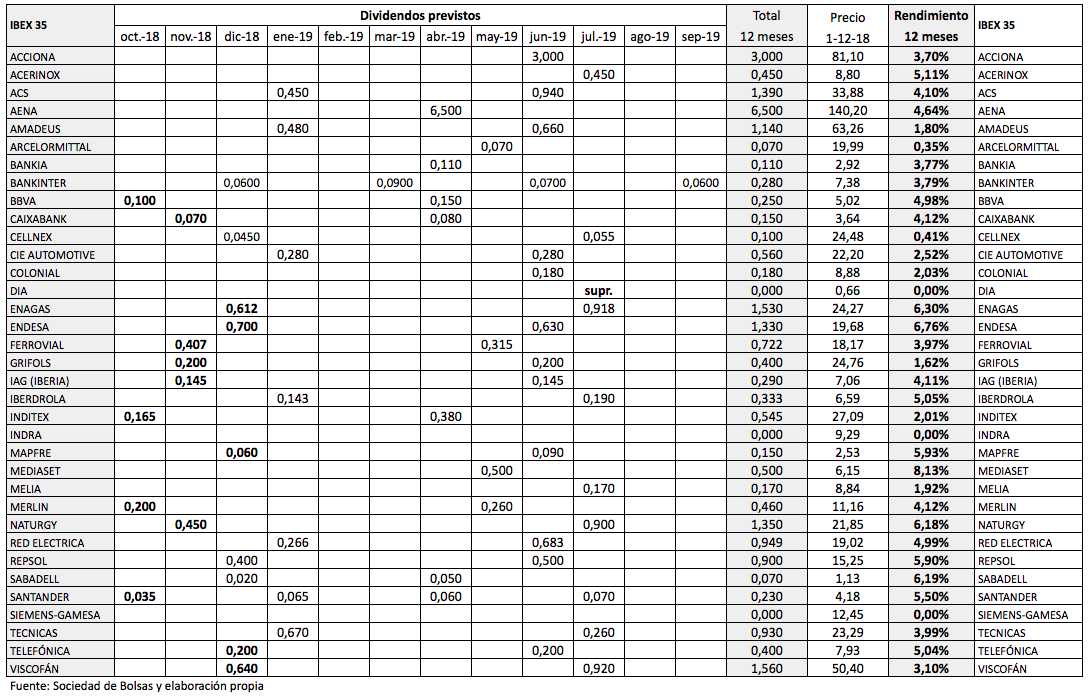 El cuadro siguiente recoge los dividendos ordinarios previstos para los próximos meses hasta septiembre de 2019 según la Sociedad de Bolsas, salvo en el caso de las empresas que se indican a continuación, para las que me he basado en las previsiones de las propias compañías. Los datos de la Sociedad de Bolsas se basan mayoritariamente en los pagos realizados en los últimos doce meses.