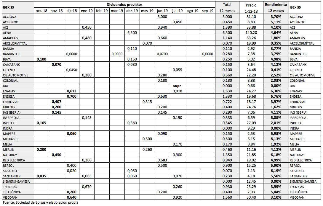 Dividendos del IBEX 35 previstos para los próximos doce meses (octubre 2018 – septiembre 2019) Actualizado 1-12-2018