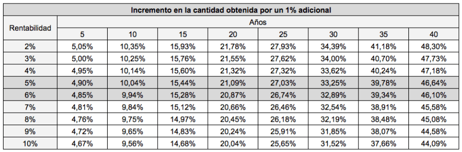 En términos generales, se puede decir que un incremento del 1% en la tasa de ganancia anual incrementa el capital en un porcentaje similar al número de años transcurridos. Como se ve en la segunda columna del cuadro siguiente, cada 1% adicional en un plazo de 5 años incrementa el capital final obtenido alrededor de un 5%. En la tercera columna vemos que cada 1% adicional en un plazo de 10 años incrementa el capital final en torno al 10%, etc. A un plazo de 40 años los incrementos ya son de en torno al 45%.