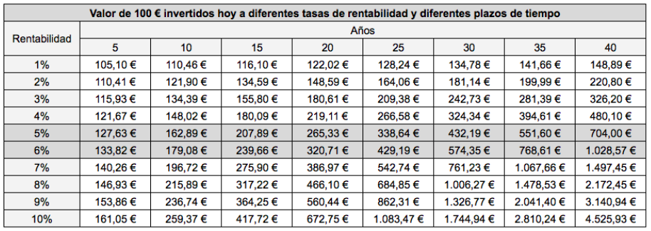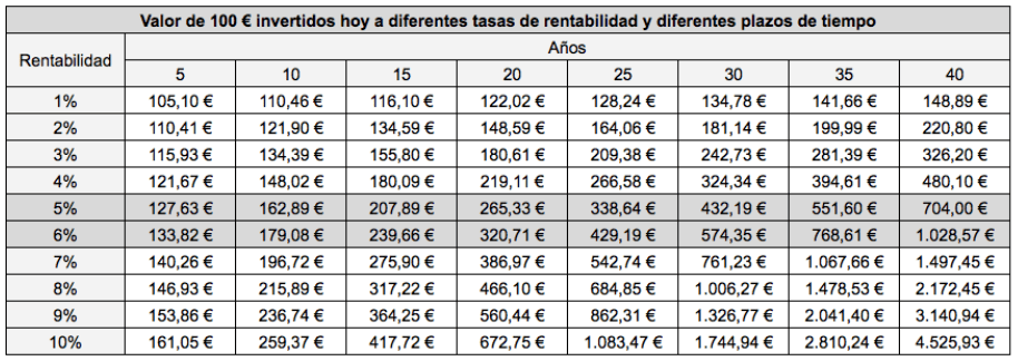 El cuadro siguiente indica en cuánto se convierten 100 € invertidos a diferentes tasas de rentabilidad durante diversos plazos de tiempo. Por ejemplo, en un período de cinco años, la cantidad obtenida es de 127,63 € a una tasa del 5% anual y de 133,82 € a una tasa del 6% anual. Sin embargo, vemos que cuanto mayor es el plazo, más crece la diferencia entre invertir a una u otra tasa. En un período de 40 años, plazo que correspondería a un plan de pensiones, los 100 € se convierten en 704 € al 5% y en 1.028,57 € al 6%.