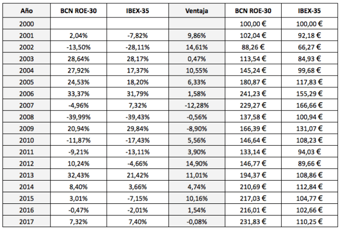 Vemos que el BCN ROE-30 superó al IBEX 35 casi cada año. Las excepciones se dieron en los tres años consecutivos de 2007 a 2009 y en 2017. Cien euros invertidos en diciembre de 2000 en el índice se habrían revalorizado a 231,83 € mientras que en el IBEX 35 solo lo habrían hecho a 110,25 €.