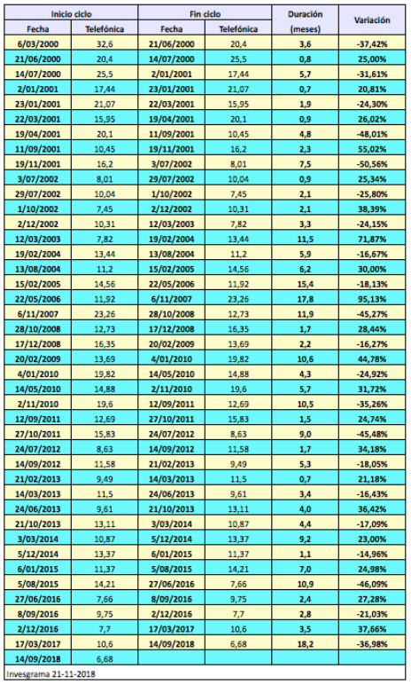 La tabla siguiente recoge los ciclos alcistas (definidos como alzas de por lo menos el 20%) y ciclos bajistas (definidos como caídas de al menos el 15%) de las acciones de Telefónica desde que alcanzaran su máximo histórico de 32,6 € el 6 de marzo de 2000. Los precios no han sido ajustados por ampliaciones de capital ni por dividendos.