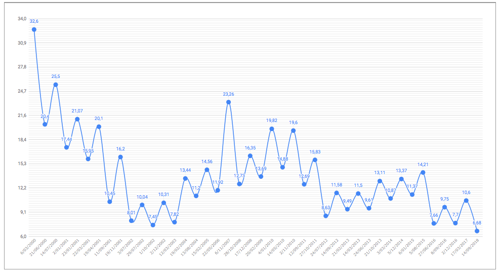 Puede observarse que la última fase bajista, que ha tenido lugar entre el 17 de marzo de 2017 y el 14 de septiembre de 2008 (suponiendo que efectivamente ya ha concluido), ha sido la más extensa de los últimos 18 años: ha durado más de 18 meses, casi 12 meses más que la media. El siguiente ciclo bajista más largo tuvo una duración de 15,4 meses y tuvo lugar entre febrero de 2015 y mayo de 2016, aunque en aquella ocasión la minusvalía fue del 18,13%, menos de la mitad que en el último ciclo.