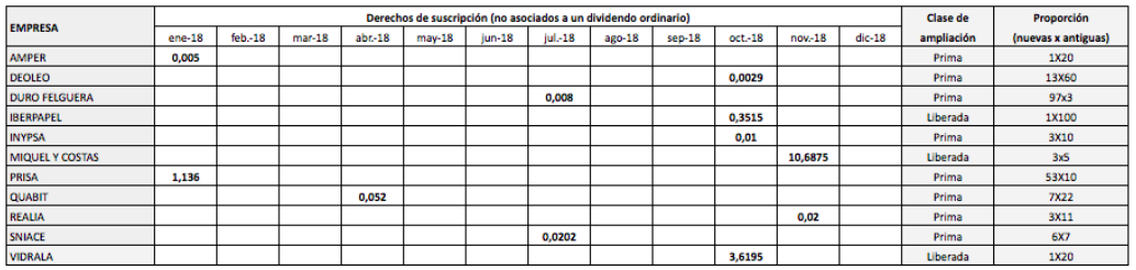 El cuadro siguiente recoge los derechos de ampliaciones de capital no asociadas a un dividendo ordinario. La mayoría son ampliaciones con prima de emisión. (Nota: se ha corregido la información relativa a la ampliación de Duro Felguera)