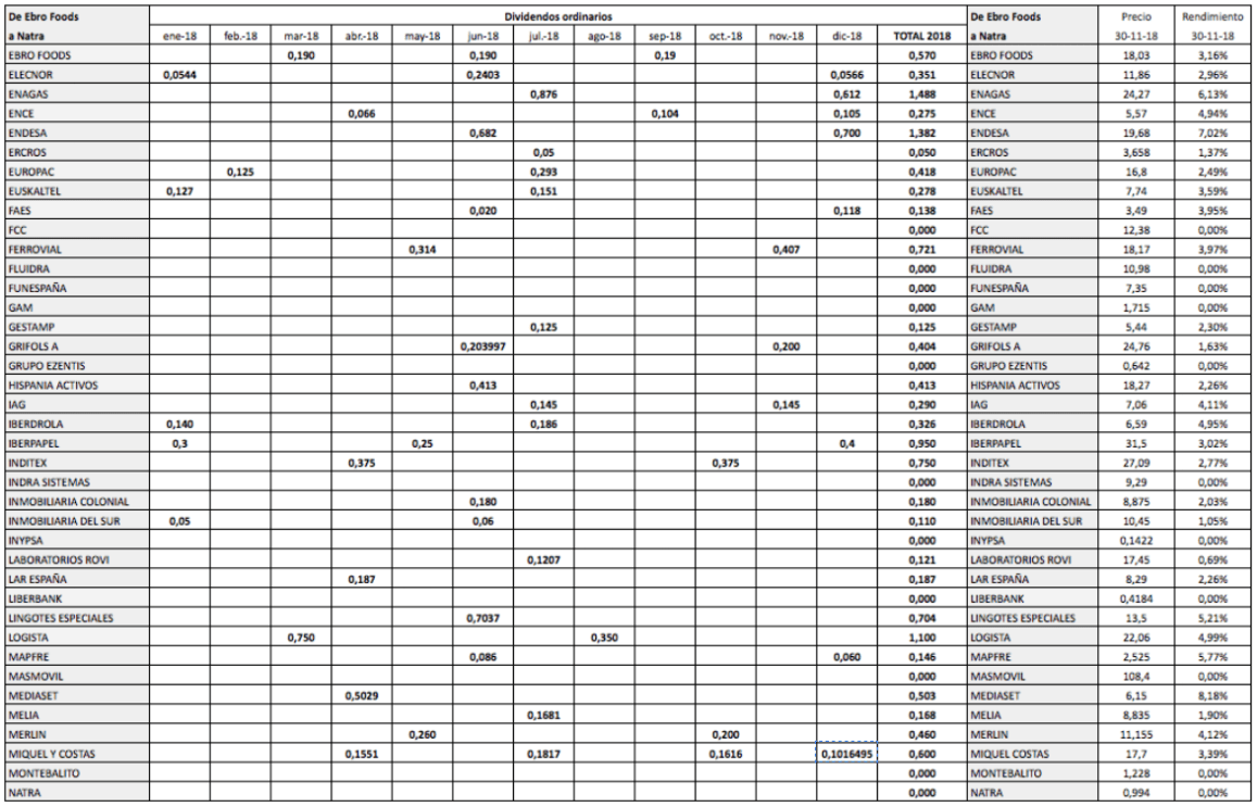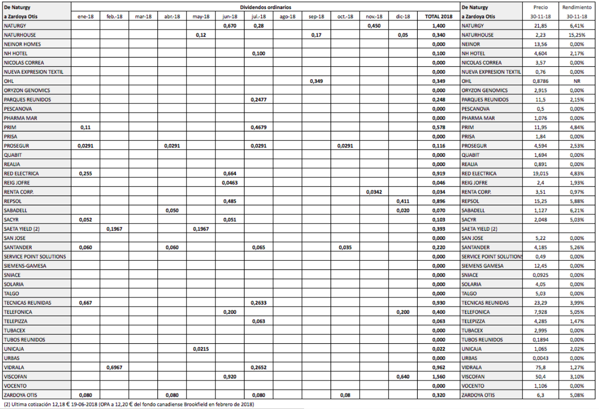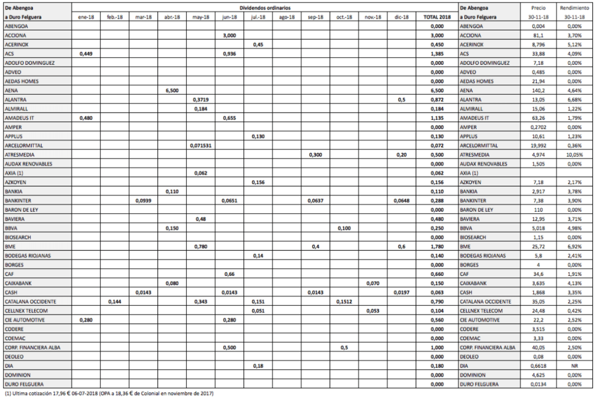 En la columna correspondiente a los dividendos de diciembre, se ha indicado en negrita los pagos confirmados. En los otros casos se trata del pago de diciembre de 2017 y se espera sea similar este año.