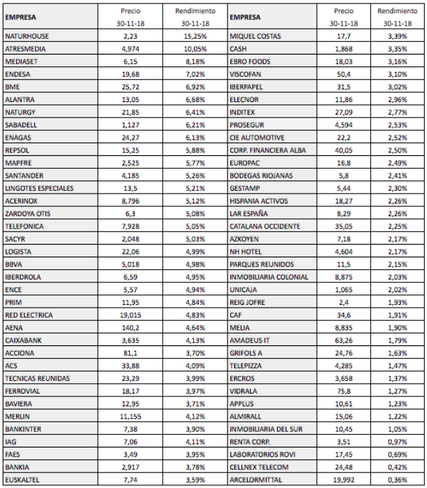 Las tres tablas siguientes recopilan los dividendos ordinarios pagados por las empresas cotizadas en el mercado continuo español a lo largo de 2018. No se han tenido en cuenta compañías domiciliadas en el extranjero (Airbus, Aperam, Bayer, Berkeley, CCEP, Edreams, Reno Medici), con la excepción de ArcelorMittal. Los datos han sido obtenidos mayoritariamente de la Sociedad de Bolsas y de la Bolsa de Madrid.