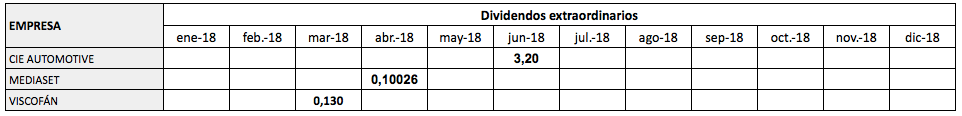 CIE Automotive, Mediaset y Viscofán han abonado dividendos extraordinarios. El pago extraordinario de Inditex (0,21 € en octubre de 2018) ha sido considerado como ordinario porque se viene realizando desde hace más de tres ejercicios consecutivos.