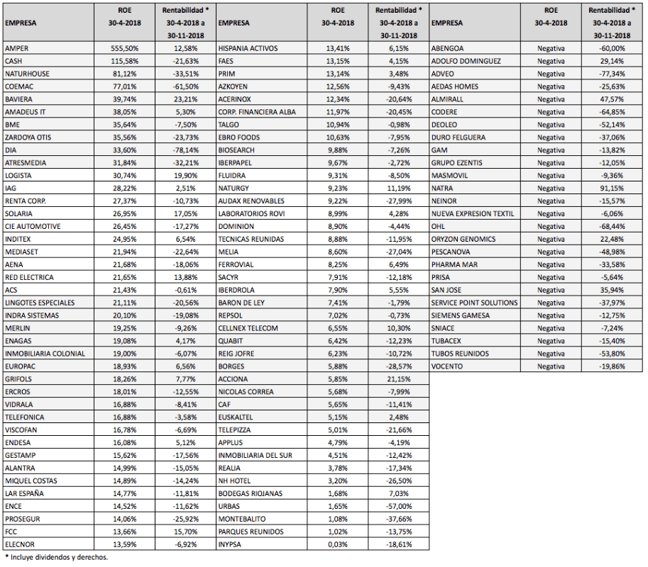 El cuadro siguiente ordena las empresas no financieras del mercado continuo (sin compañías domiciliadas en el extranjero) según su ratio ROE de acuerdo con los datos del balance de situación del ejercicio 2017. A continuación figura la rentabilidad con dividendos de sus acciones desde el 30 de abril al 30 de noviembre de 2018. La rentabilidad incluye dividendos ordinarios y extraordinarios, así como derechos procedentes de ampliaciones de capital, ya sean liberadas o con prima de emisión.