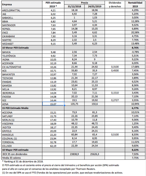 El segundo ranking, IBEX PER Estimado, ordena los mismos valores según el ratio PER obtenido a partir del beneficio por acción de consenso de los analistas. Vemos que de momento hay pocas diferencias entre ambos.