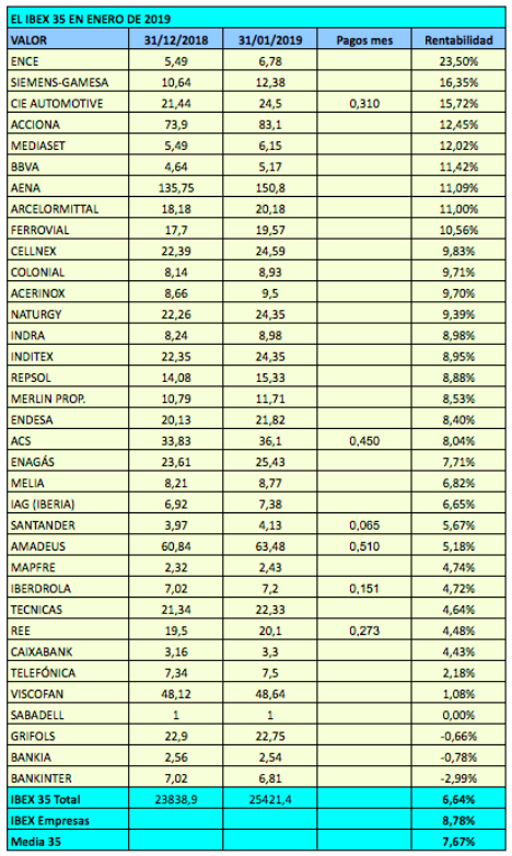 Los valores del IBEX 35 más rentables en enero fueron Ence, que entró el 24 de diciembre de 2018, Siemens-Gamesa, CIE Automotive, Acciona y BBVA.