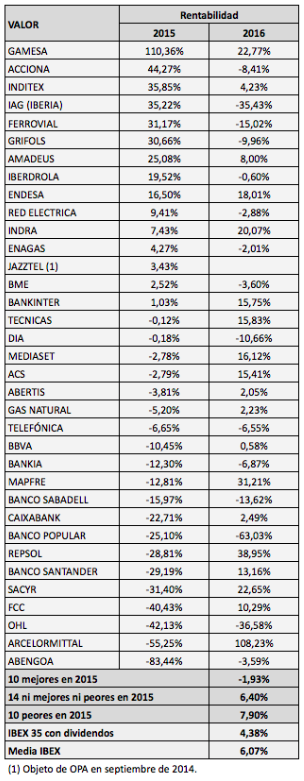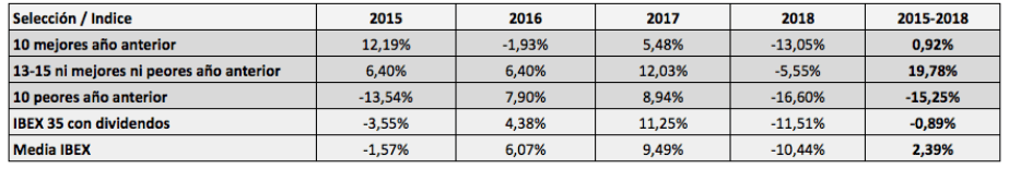 La tabla siguiente indica los resultados en 2015 en base al ranking de rentabilidad de 2014. Se ha excluido a Jazztel porque si bien la compañía continuó en el IBEX hasta junio de 2015, fue opada en septiembre de 2014. Vemos que los diez mejores valores en 2014 ganaron de media un 12,19% en 2015, mientras que los diez peores en 2014 perdieron un 13,54%.