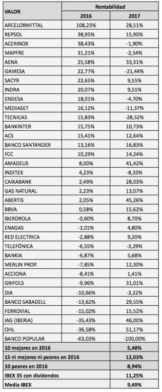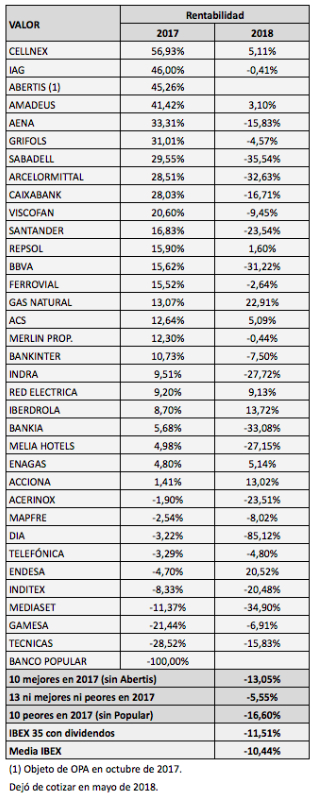 En 2018 no se ha tenido en cuenta Abertis, que fue objeto de una OPA en octubre de 2018 y salió de bolsa en mayo de 2018, ni Banco Popular ya que perdió la totalidad de su valor. Ese año, tanto las diez peores acciones de 2017 como las diez mejores lo hicieron peor que la media del mercado, al perder un 16,6% y un 13% respectivamente.