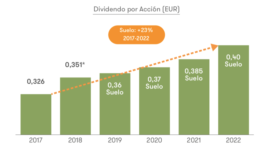 El pay-out (porcentaje de distribución) se situará entre un 65% y un 75%. El dividendo máximo que podría pagarse a cargo de 2022 sería, pues, del 75% de 0,62 €, o sea 0,465 €.