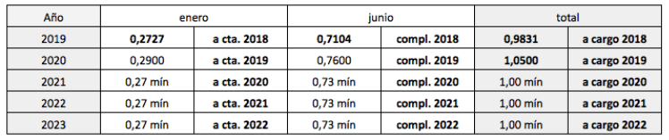 A cargo de 2019 pagará 1,05 €, de los que previsiblemente unos 0,29 € en enero de 2019 como pago a cuenta y unos 0,76 € en junio de 2020 como complementario.