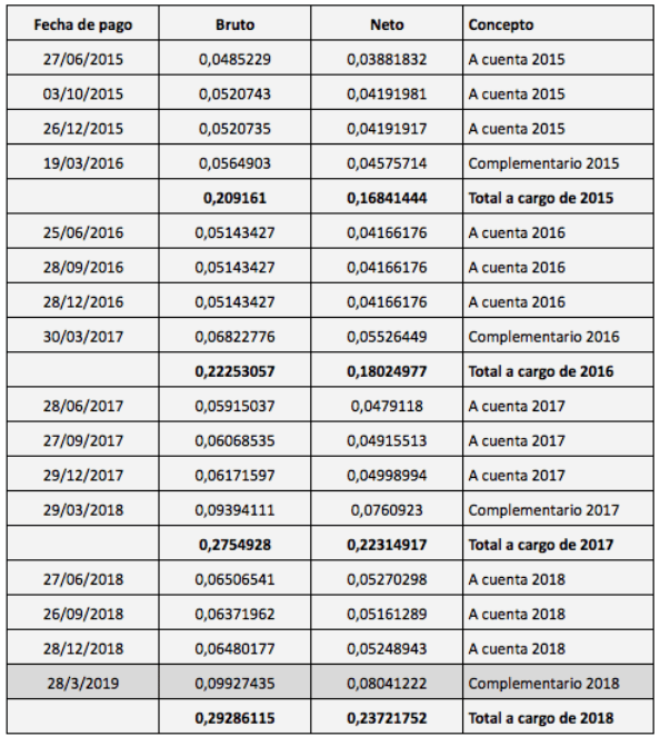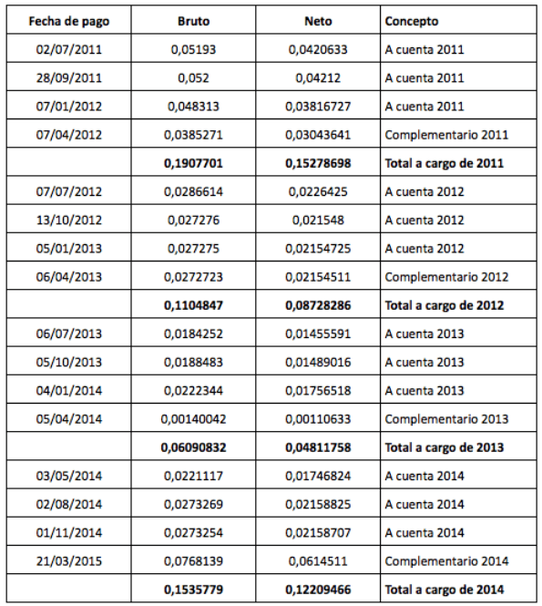 Los dividendos del banco se caracterizan por tener hasta ocho decimales. En las tablas siguientes, realizadas a partir de datos obtenidos de la página web de la entidad, se indican los pagos a cuenta y el complementario abonados a cargo de los ejercicios 2011 a 2018.