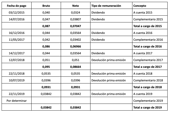 El 22 de noviembre de 2019 repartió un dividendo con cargo a la prima de emisión por 0,03842 €, tampoco sujeto a retención fiscal. Equivale al dividendo a cuenta de 2019.