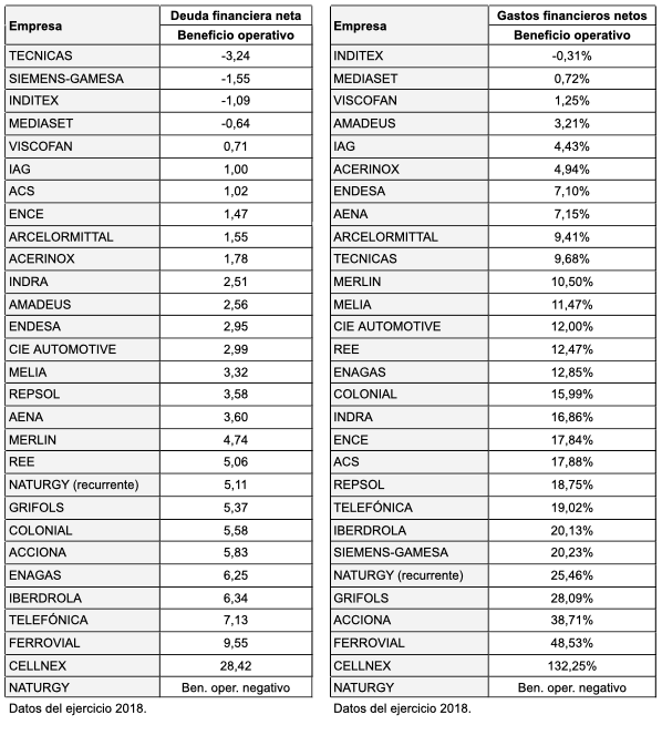 A continuación reproduzco las tablas de solvencia del ejercicio 2018. En la primera, las compañías que tienen ratios negativos es porque su deuda financiera neta fue negativa en 2018 (es decir, el dinero en efectivo fue superior a la deuda financiera), a excepción de Naturgy, en cuyo caso el valor negativo se debe a las pérdidas operativas. Para esta compañía también se han indicado los ratios en términos recurrentes.