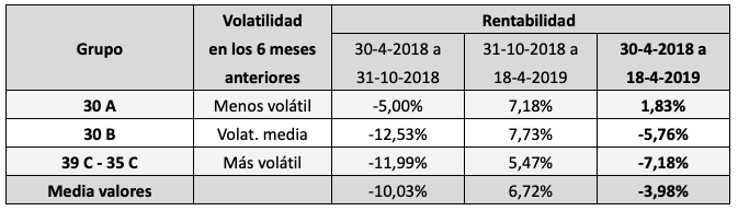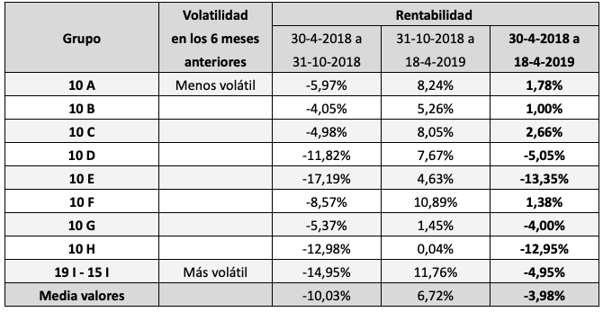 La tabla siguiente recoge los resultados hasta la fecha. El primer grupo, compuesto por los diez valores menos volátiles, gana un 1,78% desde el 30 de abril de 2018 hasta el pasado 18 de abril, mientras que la rentabilidad media de todos los valores (99 en el primer semestre de abril a octubre de 2018 y 95 valores desde noviembre de 2018) ha sido negativa en un 3,98%.