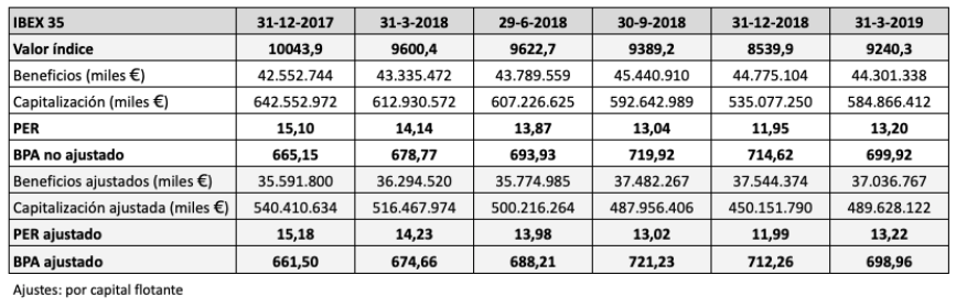 A marzo de 2018, esta magnitud era de 674,66 puntos: el crecimiento en esos doce meses ha sido de solo el 3,6%. En el mismo período, el indice cayó un 3,75%. Esto significa que la bolsa española se ha abaratado en términos relativos, al pasar de un PER de 14,23 a un PER de 13,22 entre marzo de 2018 y marzo de 2019. Actualmente (18 de junio de 2019) cotiza a los mismos niveles, en torno a los 9.250 puntos.