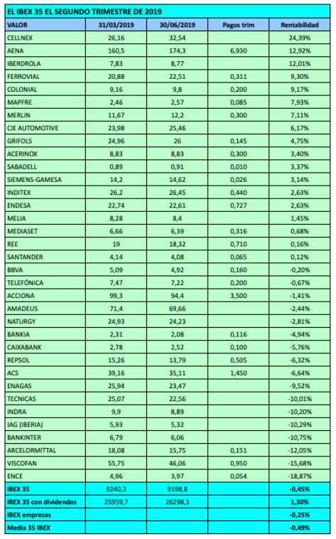 b) Rentabilidad de los valores del IBEX 35 en el segundo trimestre de 2019.