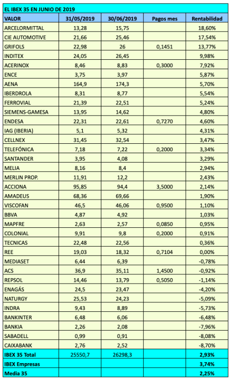 a) Rentabilidad de los valores del IBEX 35 en junio de 2019.
