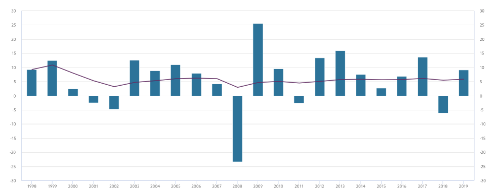 Desde el 1 de enero de 1998 hasta el 31 de marzo de 2019, la rentabilidad del Fondo ha sido del 5,84% anual. Tras dediucir la inflación y los costes administrativos, la rentabilidad real ha sido del 3,9% anual. El gráfico siguiente indica la rentabilidad por años del Fondo (barras verticales) y la rentabilidad anual a largo plazo (línea horizontal). Se observa que la rentabilidad a largo plazo se estabiliza en torno al 5% anual desde 2009.