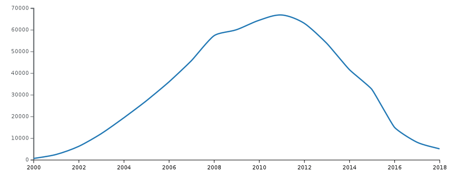 Es decir, mientras que el fondo de pensiones de Noruega multiplicó su patrimonio por 2,6 en ese período, el fondo de reserva de las pensiones españolas se redujo un 88% bajo los dos últimos gobiernos del Partido Popular. El gráfico siguiente, obtenido de Wikipedia, ilustra la evolución de fondo de reserva de la seguridad social española desde su creación en el año 2000 hasta 2018.